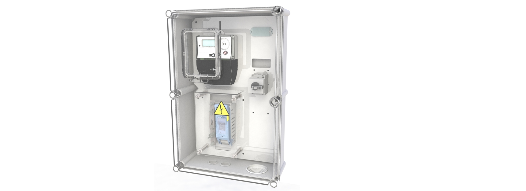 - Envolvente de poliéster reforzado con fibra de vidrio y tapa de policarbonato transparente resistente a los UV. Con ventanilla practicable para acceso al contador. Módulo MH64.