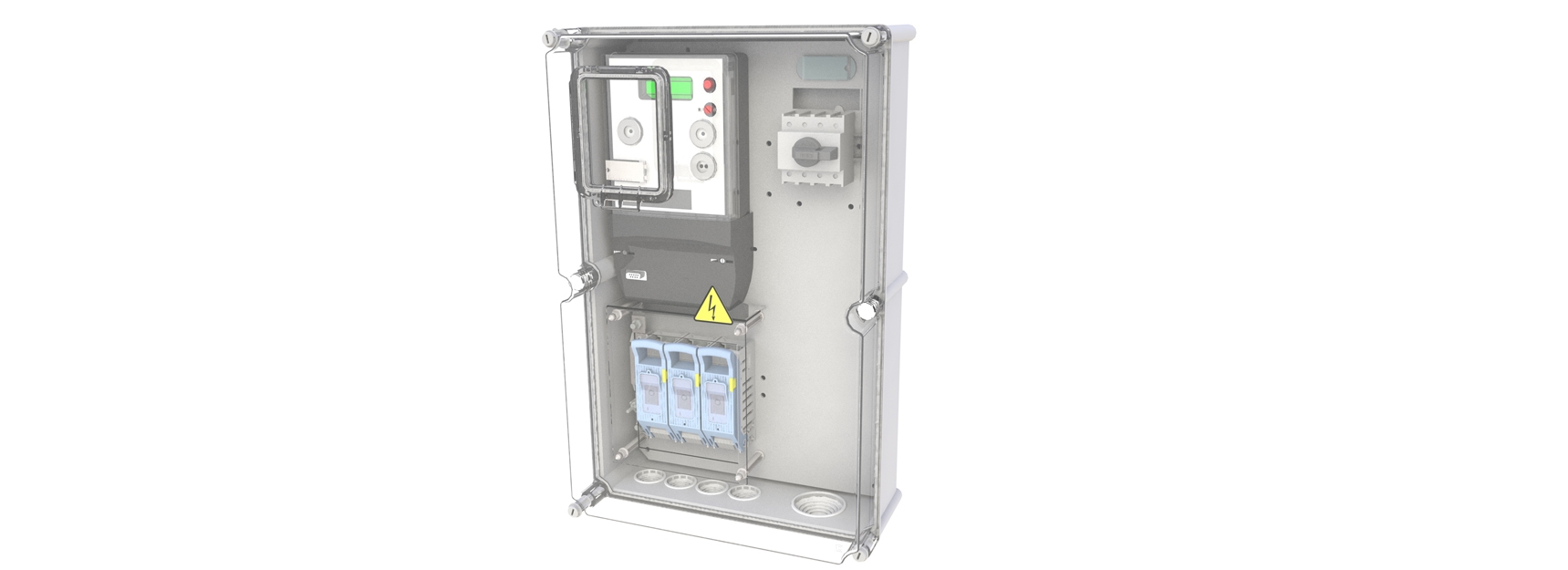 - Envolvente de poliéster reforzado con fibra de vidrio y tapa de policarbonato transparente resistente a los UV. Con ventanilla practicable para acceso al contador. Módulo 7045.