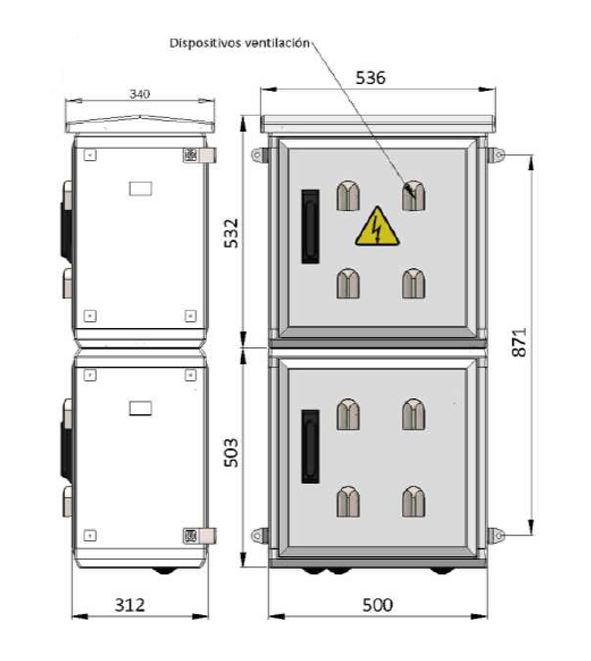 - Envolvente tipo Maxipol de poliéster reforzado con fibra de vidrio y puertas con cierre triangular de tres puntos con dispositivo de bloqueo para candado.