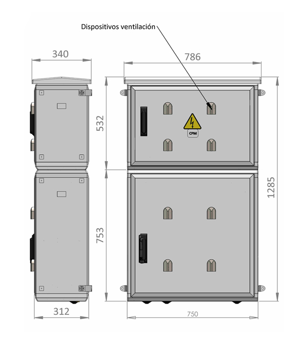 - Envolvente tipo Maxipol de poliéster reforzado con fibra de vidrio y puertas con cierre triangular de tres puntos con dispositivo de bloqueo para candado.