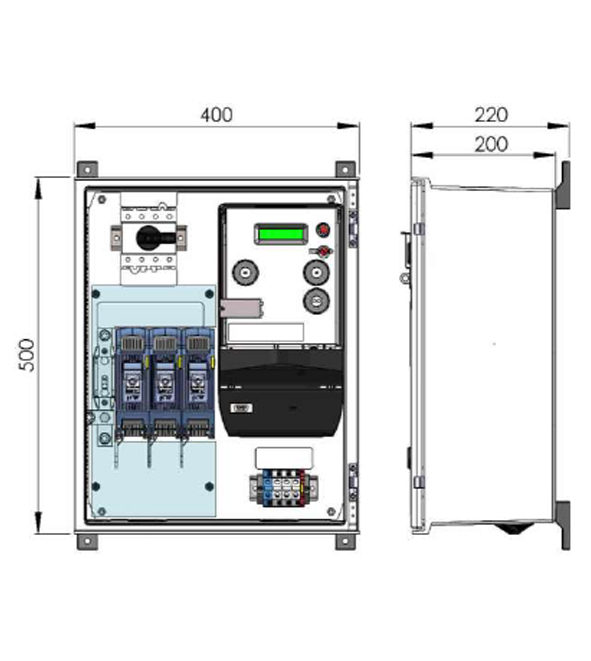 - Bornes de salida: DI (3F+N) con capacidad hasta 25 mm2, señal (hilo rojo) con capacidad hasta 4 mm2, borne tierra (verde/amarillo) capacidad hasta 25mm2.
